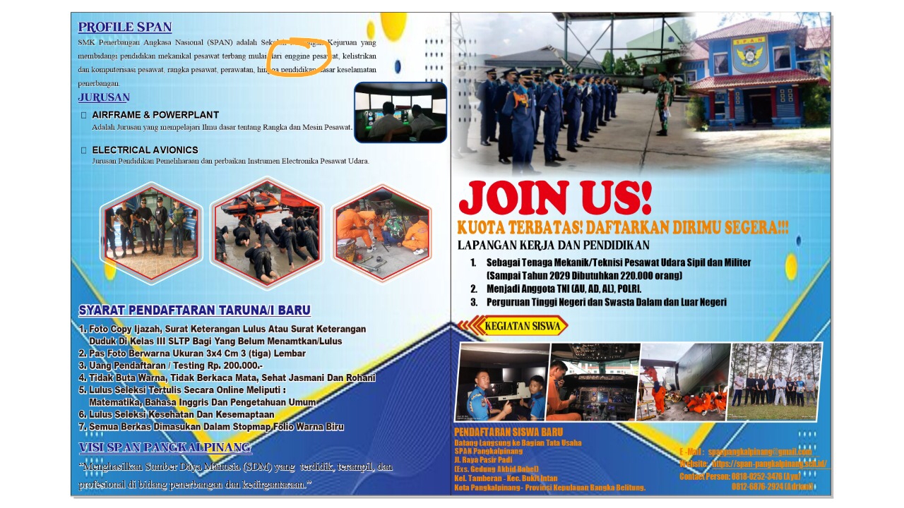 “Oleh karena itu disini saya mengajak para peserta didik lulusan SMP/Mts/sederajat untuk melanjutkan study nya ke SMK Penerbangan satu-satunya di Bangka Belitung yaitu SPAN Pangkalpinang ini lah tempatnya untuk dilatih menjadi seorang teknisi pesawat yang berkompeten dalam sikap/attitude dan skill yang bagus dengan tenaga pendidik yang berpengalaman dan berlisensi ahli keperawatan pesawat udara. Yang searah dengan kegiatan ketarunaan dan magang praktek di maskapai penerbangan Sipil dan militer,” paparnya.