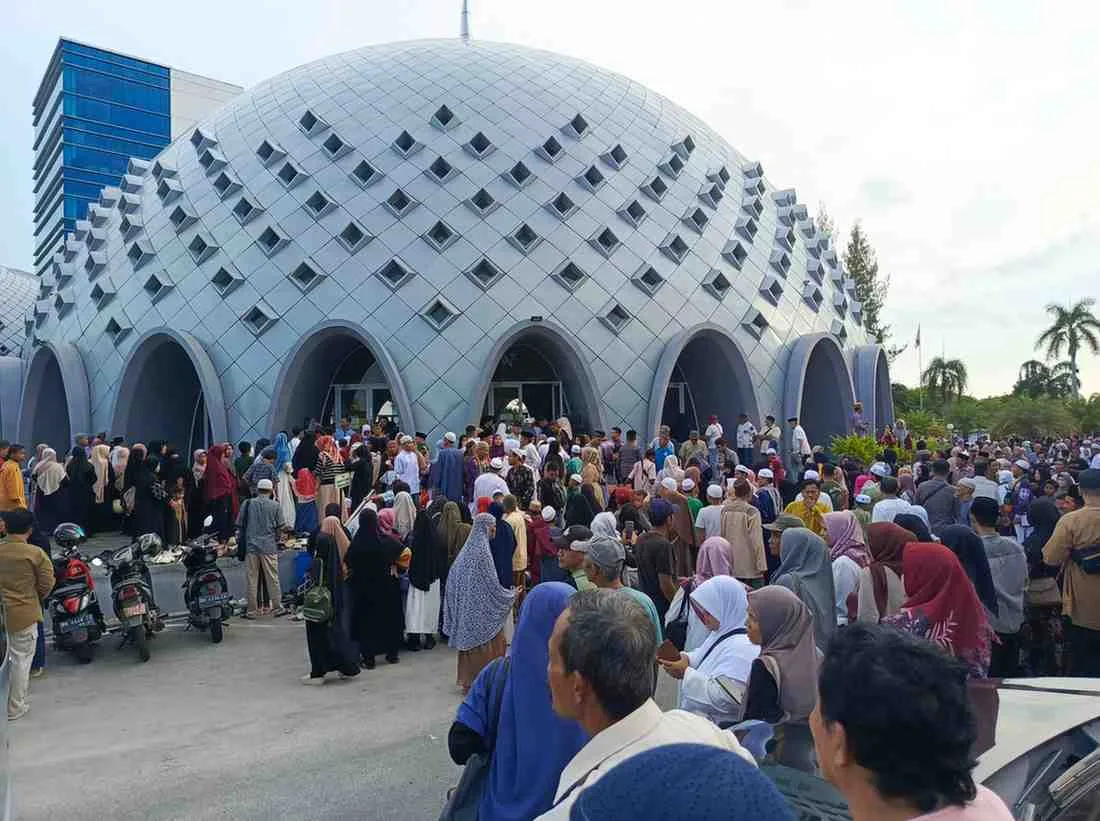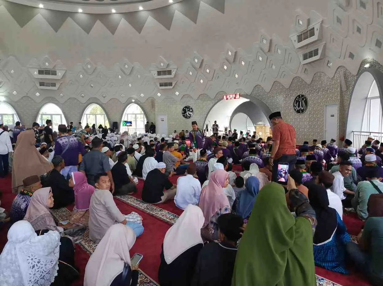Halaman Masjid Agung Kubah Timah diramaikan oleh keluarga dari para jamaah yang akan berangkat ke tanah suci dalam acara pelepasan calon jamaah haji Kota Pangkalpinang. Pemkot Pangkalpinang turut hadir di tengah-tengah para jamaah.